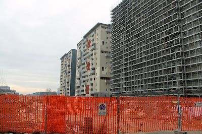 Non sono nemmeno riuscito a capire quante siano le torri di 14 piani in costruzione in questo quartiere sorto al posto dei capannoni industriali delle vecchie fabbriche Pirelli in Bicocca. Onestamente non riesco a farmele piacere: troppo ingombranti, creano una sorta di muraglione che racchiude al centro un giardino semi nascosto. Preferisco delle costruzioni anche più alte, ma che non creino una cortina come in questo caso. Per fortuna hanno usato dei colori decisamente vivaci, gli inserti in rosso e giallo rallegrano il complesso.